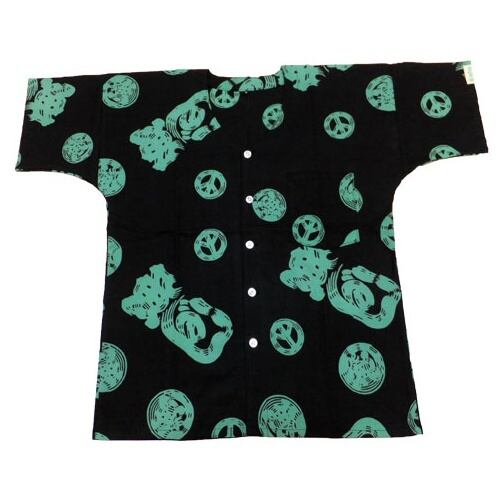 本染め魚河岸シャツ Lサイズ 認定証付き 木綿晒 平和柄 黒×ミント 日本製 注染そめ 浴衣生地 ピースマーク 職人の仕立てシャツ てぬぐいシャツ 濱いちシャツ 焼津 浜通り 港町