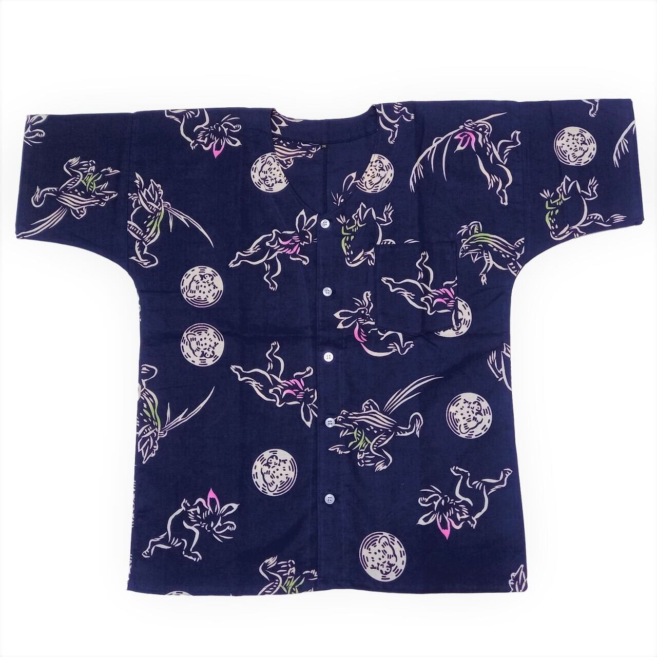 本染め魚河岸シャツ Mサイズ 国宝・鳥獣戯画 高山寺公認 認定証付き 木綿晒 紺×白(桜色&若草色ぼかし入り) 日本製 注染そめ 兎 蛙 浴衣生地 職人の仕立てシャツ てぬぐいシャツ 濱いちシャツ 焼津 浜通り 港町