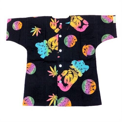 本染め魚河岸シャツ キッズ110サイズ 認定証付き 木綿晒 麻の葉柄 黒×虹色グラデーション レインボー 子供用 日本製 注染そめ リーフマーク 浴衣生地 職人の仕立てシャツ てぬぐいシャツ 濱いちシャツ 焼津 浜通り 港町