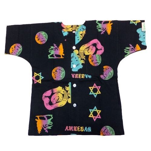 本染め魚河岸シャツ キッズ用90サイズ 認定証付き 木綿晒 籠目紋&獅子柄 黒×虹色グラデーション レインボー 子供用 日本製 注染そめ 六芒星 浴衣生地 職人の仕立てシャツ てぬぐいシャツ 濱いちシャツ 焼津 浜通り 港町