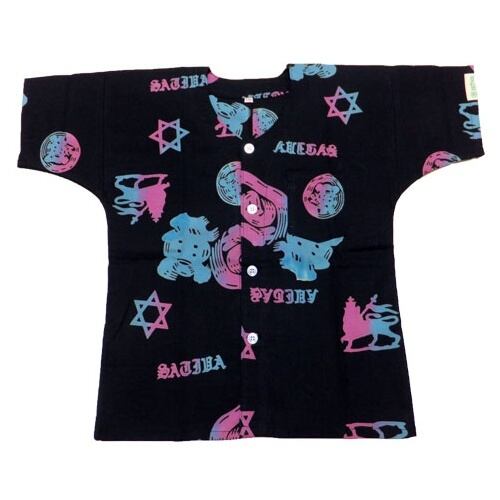 本染め魚河岸シャツ キッズ用100サイズ 認定証付き 木綿晒 籠目紋&獅子柄 黒×ピンク水色グラデーション 子供用 日本製 注染そめ 六芒星 浴衣生地 職人の仕立てシャツ てぬぐいシャツ 濱いちシャツ 焼津 浜通り 港町