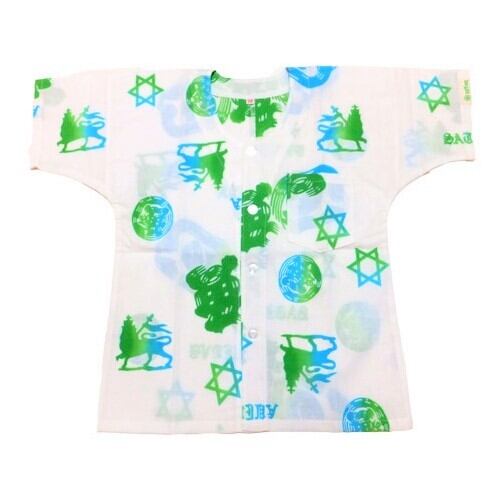 本染め魚河岸シャツ キッズ用100サイズ 認定証付き 木綿晒 籠目紋&獅子柄 白×黄緑・水色グラデーション 子供用 日本製 注染そめ 六芒星 浴衣生地 職人の仕立てシャツ てぬぐいシャツ 濱いちシャツ 焼津 浜通り 港町