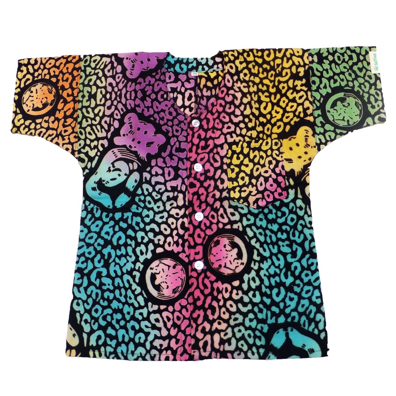 本染め魚河岸シャツ キッズ用110サイズ 認定証付き 木綿晒 ヒョウ柄 子供用 黒×虹色 レインボー染め 日本製 注染そめ アニマル柄 浴衣生地 職人の仕立てシャツ てぬぐいシャツ 濱いちシャツ 焼津 浜通り 港町