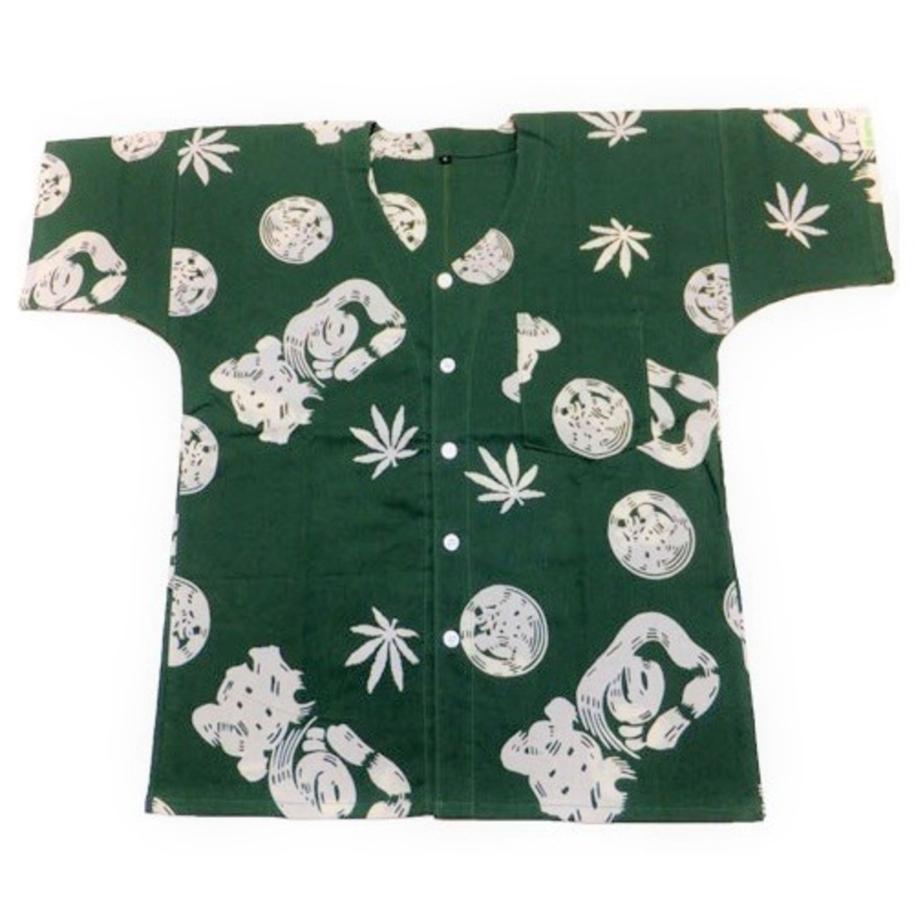 本染め魚河岸シャツ Sサイズ 認定証付き 木綿晒 麻の葉柄 深緑×白 日本製 注染そめ 浴衣生地 リーフマーク 職人の仕立てシャツ てぬぐいシャツ 濱いちシャツ 焼津 浜通り 港町